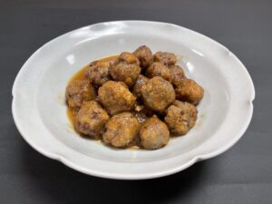 • これらをフライパンに入れて中火にかけ、トロミをつけて、肉団子を加えよくからめ、
