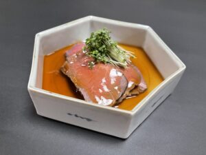 • 牛肉を切り、器に盛り付けてタレをかけて出来上がり!