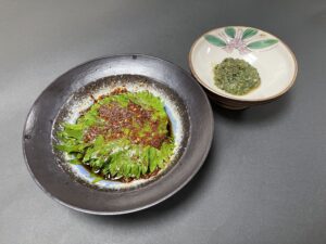 • 青シソ1枚に、混ぜ合わせた調味料を小さじ2分の1ずつを塗って、清潔な保存