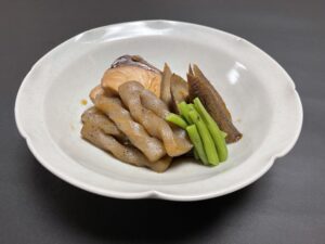 • 手綱コンニャクもゴボウの鍋に加えて3分ほど一緒にゆでて、ともにザルに上げて