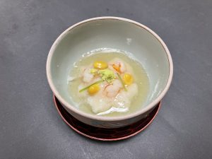 沸騰したら火を止めて、水溶き片栗粉を加えてよく混ぜる - 蒸し上がった蓮根、海老、銀杏に餡をかけて天盛りに山葵を