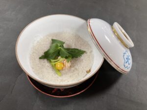 • 蒸し器に入れるお椀に、味付けした長芋を入れ、海老と銀杏をのせる