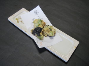 (※海苔で巻いて揚げるものを「磯辺揚げ」という) - 磯辺揚げ3個を1人前にして器に盛りつける