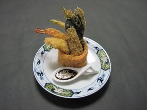 • 海老フライ、茄子のフライ、葱のフライ、ヨモギのフライ、魚のフライ